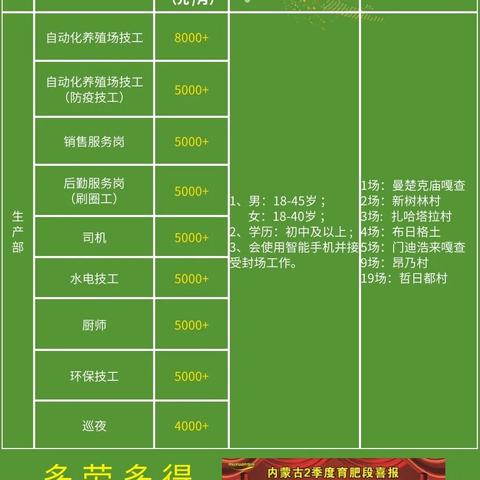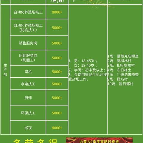 4、人力资源专员职位描述:负责招聘、培训、绩效考核等人力资源管理工作,优化人力资源配置,提高员工满意度,岗位要求: (1)人力资源相关专业本科及以上学历;(2)熟悉人力资源管理流程,具备良好的沟通能力;(3)具备较强的组织协调能力和团队协作精神;(4)有人力资源管理经验者优先,薪资待遇:月薪范围XX元-XX元,具体面议。 福利待遇 公司为员工提供完善的福利待遇,包括五险一金、带薪年假、节日福利、定期体检等,公司注重员工培训和职业发展,为员工提供丰富的培训资源及晋升机会。 报名方式 应聘者请将个人简历发送至招聘邮箱[email protected],邮件主题请注明应聘职位,简历请包含个人信息、教育背景、工作经历等内容,我们将根据应聘者简历进行筛选,并通知符合条件的应聘者参加面试。 截止日期 本招聘信息长期有效,欢迎广大求职者关注并报名。 联系方式 如有任何疑问,请联系人力资源部电话:XXX-XXXX-XXXX或发送邮件至招聘邮箱[email protected]。 我们期待与您携手共创美好未来! 奈曼始终坚持以创新、卓越为核心价值观,致力于打造一流的产品和服务,我们尊重人才、注重团队,为员工提供良好的工作环境和发展空间,如果您有激情、有梦想,欢迎加入奈曼,共同创造更加辉煌的明天!特此公告 奈曼人力资源部 XXXX年XX月XX日。 以上就是奈曼最新招聘信息,我们真诚地欢迎广大求职者加入我们的团队,我们相信,只要努力,就一定能实现自己的价值,期待您的加入!
