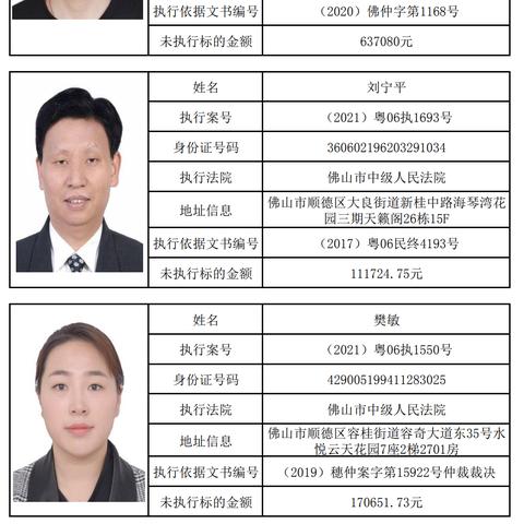 根据最新公布的数据,本次佛山的失信被执行人名单中,共有XXX人被列入,以下是部分失信被执行人的具体信息: